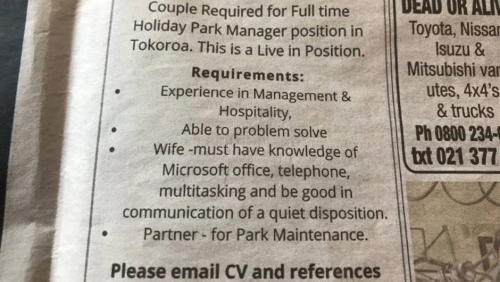 A recent classified ad seeking a couple for holiday park manager position by Tokoroa's Glenview Holiday Park caused a stir for this reason. The advert set a number of requirements including a wife who must be "good in communication [and] of a quiet disposition" and "Partner - for Park Maintenance".